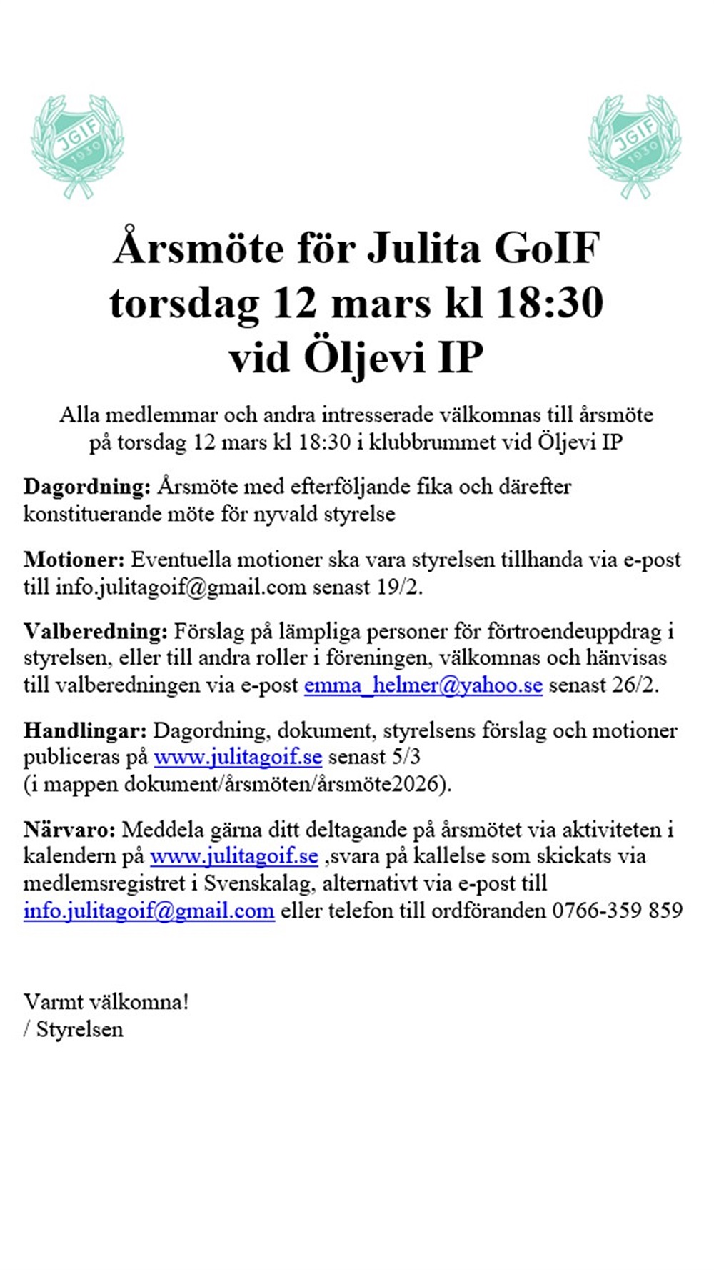 Styrelsen i Julita GoIF har ambition är att skicka ut minst två medlemsbrev per år för att informera om vad som är på gång i föreningen.
